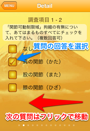 | 数多い調査項目(全55問)をフリックで次々と選択が可能 |